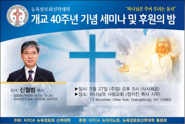 개교 40주년을 맞이한 해외한인장로회 (KPCA) 뉴욕장로회신학대학은 전 세계 한인디아스포라 800만을 섬길 수 있는 목회자와 선교사, 그리고 크리스찬 리더들을 양성하기 위한 신학교육 기관입니다. 본교는 2003년 New York 주 정부 교육국으로부터 정식 인가를 받은 신학교육기관으로서 ABHE (성서대학 협의회) 와 ATS (북미 신학대학원 협의회) 회원 자격을 얻기 위하여 현재 진행 과정을 밟아가고 있습니다. 이제 더 힘찬 도약을 위해 개교40주년을 맞아 기념 세미나와 후원의 밤 행사를 아래와 같이 갖게 되었습니다. 부디 바쁘시더라도 왕래하셔서 자리를 빛내 주시면 감사하겠습니다.