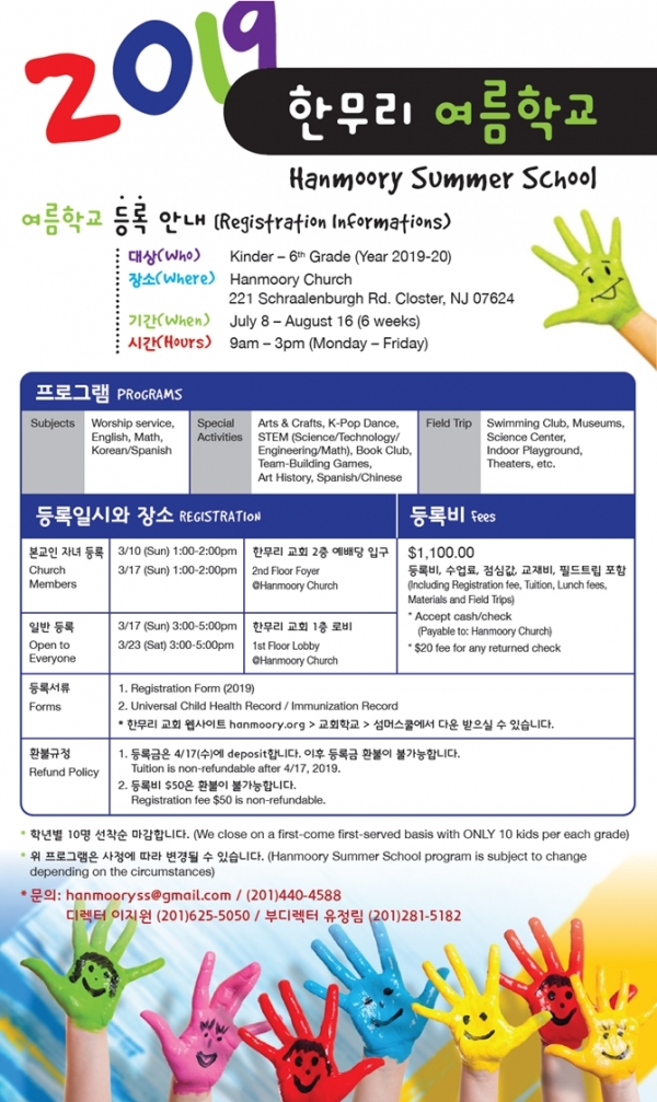 한무리 교회가 <2019 한무리 여름학교>를 오픈합니다. 자녀들에게 신앙 교육을 기반으로 한 좋은 학습 습관을 키우고, 다양하고 재미있는 경험이 남는 유익한 여름방학을 위한 탁월한 선택이 될 것입니다.