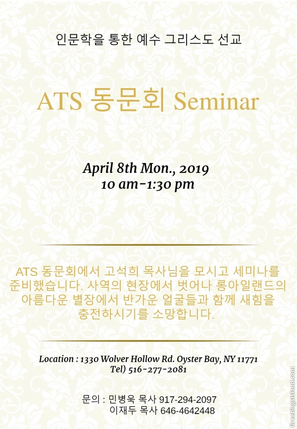 ATS 한인 동문회에서 고석희 목사님을 모시고 "인문학을 통한 예수 그리스도 선교" 라는 주제로 세미나를 개최하오니 동문 회원님들의 많은 참여를 바랍니다.