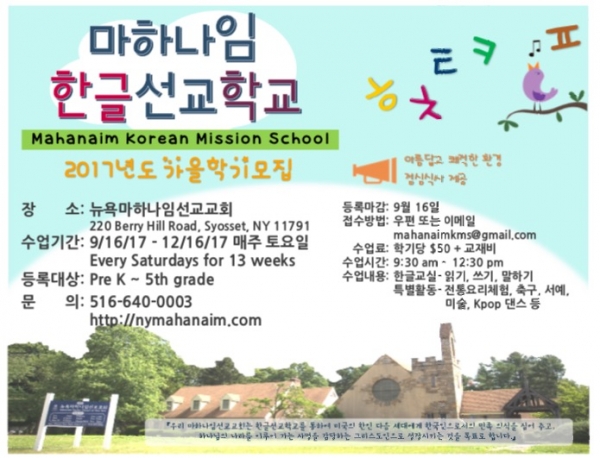 뉴욕마하나임선교교회에서는 2017년 가을학기 한글선교학교를 개강합니다.