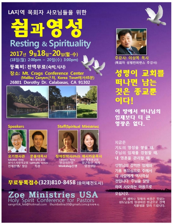 Mt. Crags Conference Center(말리부케년 근처) 에서오는 2017년 9월 18일부터 20일까지, 2박 3일로 목회자 사모님, 선교사님들을 모시고 쉼과 영성 세미나를 마련한다. 이번 세미나 주 강사는 이상목 목사님이며, 한국 미국 남미 동남아시아 등 목회자 성령컨퍼런스 주강사로 섬기고 있다.
