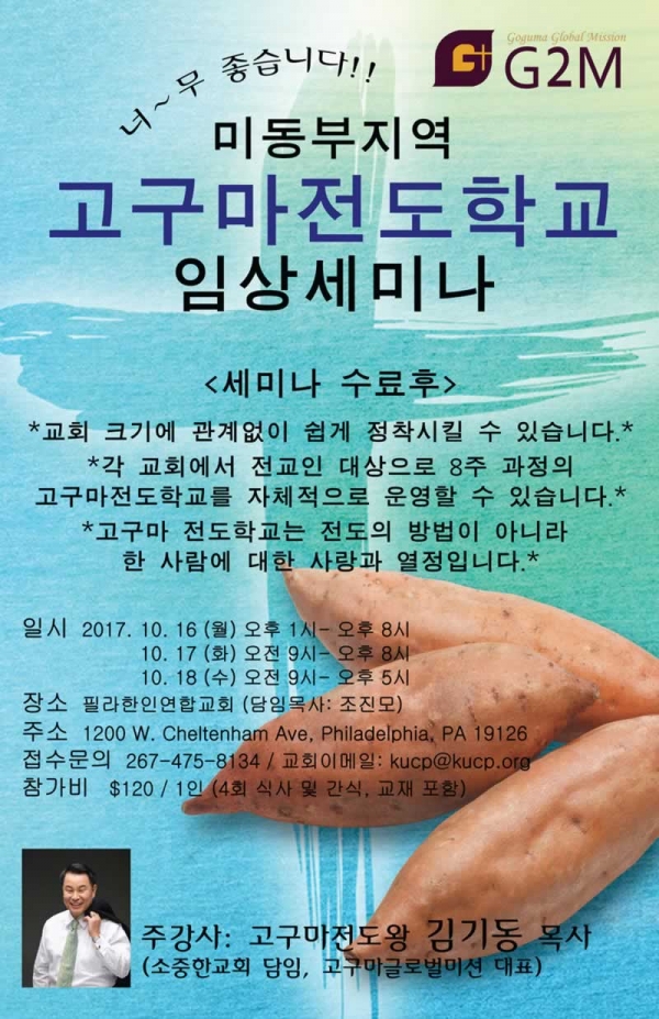 1. "한 영혼을 소중히"라는 비전을 가지고 고구마전도학교를 지역 교회에 세우고 있는 비영리전도단체 고구마글로벌미션에서는 미주동부지역 한인교회의 목회자와 평신도들을 대상으로 "미주 동부지역 고구마전도학교 임상 세미나"를 필라델피아 한인연합교회 (조진모 담임목사)에서 개최하게 되었습니다.