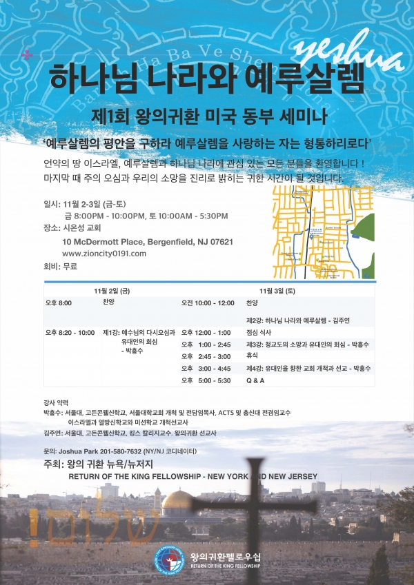 제1회 왕의 귀환 미국 동부 세미나가 11월 2일(금)과 3일(토), 2일 동안 뉴저지주 버겐필드에 위치한 시온성 교회 (10 McDermott Place, Bergenfield NJ 07621) 에서 열립니다.