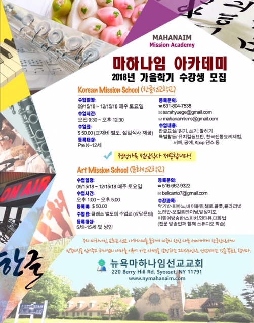 롱아일랜드 Syosset에 위치한 뉴욕 마하나임 선교교회의 '마하나임 아카데미'에서 2018년 가을학기 한글 선교학교와 문화 선교학교를 개강합니다.
