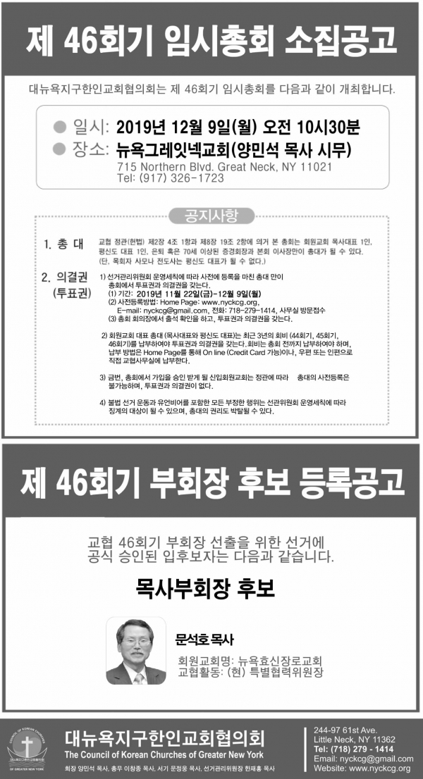 뉴욕교협 제46회기 임시총회 소집 및 부회장 후보 등록 공고