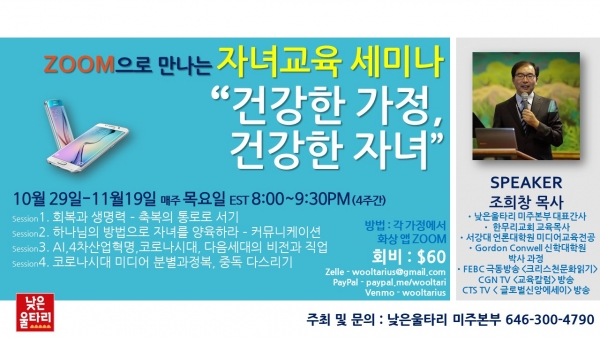 낮은울타리 미주본부(대표 : 조희창 목사)에서 "건강한 가정, 건강한 자녀"를 세워가기 원하는 부모님, 사역자님들을 위한 를 엽니다.