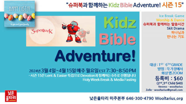 샬롬! 낮은울타리 미주본부(대표간사 : 조희창 목사)에서 ZOOM으로 만나는 <Kidz Bible Adventure 시즌15-Lent & Easter Special>을 엽니다.