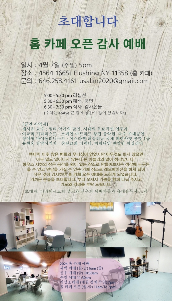 홈 카페 오픈 감사예배 페이지 정보 더라이프교회ㆍ2024-03-27 관련링크 이전글 다음글 목록 본문 홈 카페 오픈 감사예배 더라이프교회 댓글목록 등록된 댓글이 없습니다. 이전글 다음글 목록