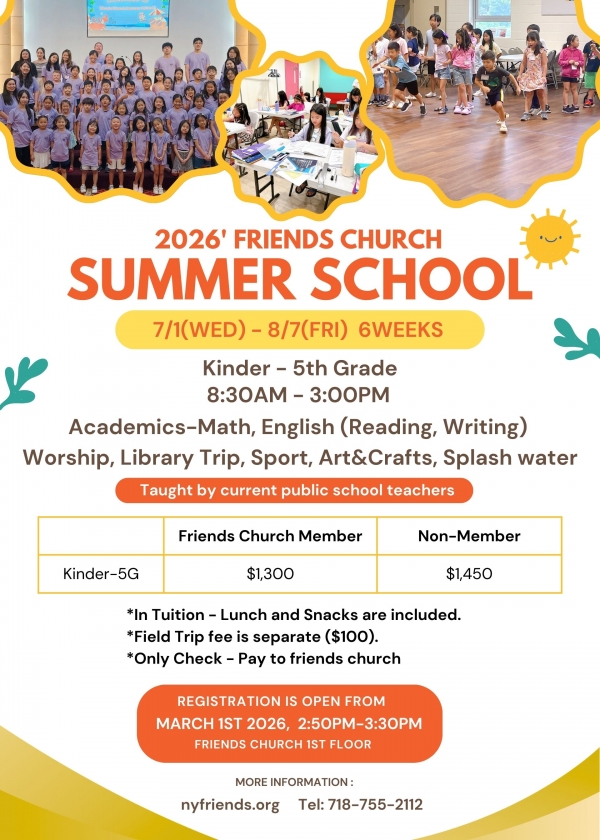 *친구교회 홈페이지 nyfriends.org  여름학교란에서 더 자세한 사항을