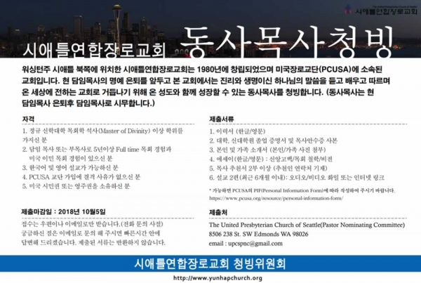 시애틀연합장로교회 동사목사 청빙