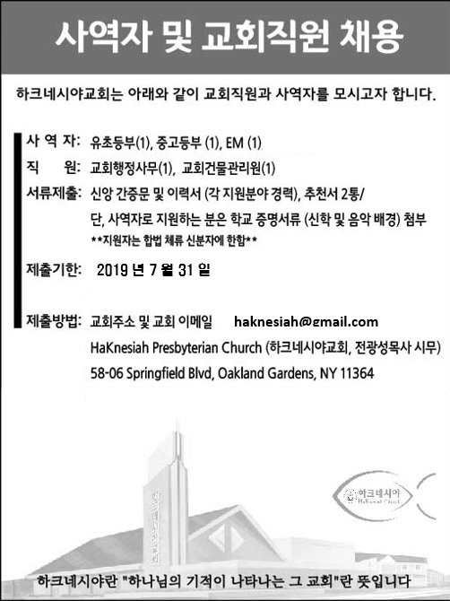 뉴욕 하크네시야 교회에서 사역자및 교회 직원을 모십니다.