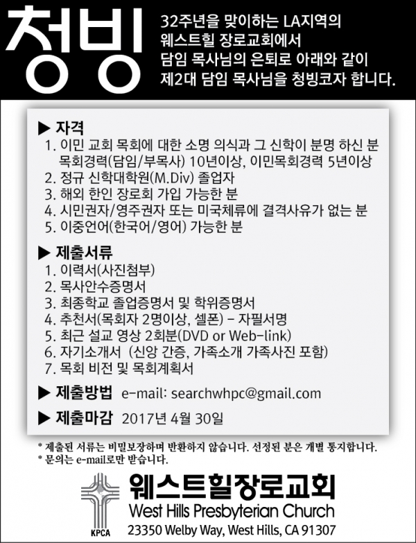 32주년을 맞이하는LA 지역의 웨스트힐 장로교회에서 담임목사님의 은퇴로 아래와 같이 제 2대 담임 목사님을 청빙코자 합니다