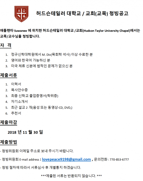 허드슨테일러 대학교 / 교회(교목) 청빙공고 > 구인