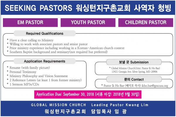 EM PASTOR, YOUTH PASTOR, CHILDREN PASTOR 사역자를 청빙합니다.