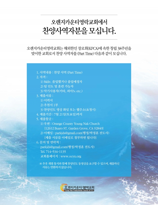 오렌지카운티영락교회는 해외한인 장로회(KPCA)에 속한 창립 38주년을 맞이한 교회로서 찬양 사역자를 (Part Time) 다음과 같이 모십니다.
