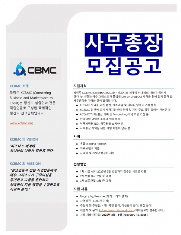 북미주 KCBMC 사무총장 모집공고 페이지 정보 KCBMCㆍ2025-01-29 관련링크 본문 북미주 KCBMC 사무총장 모집 공고 댓글목록 등록된 댓글이 없습니다. 이전글 다음글 목록