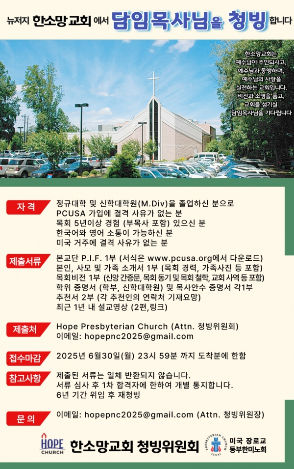 뉴저지 한소망교회에서 담임목사를 청빙합니다 페이지 정보 한소망교회ㆍ2025-05-15 관련링크 이전글 다음글 목록 본문 뉴자지 한소망교회에서 담임목사를 청빙합니다 댓글목록 등록된 댓글이 없습니다. 이전글 다음글 목록