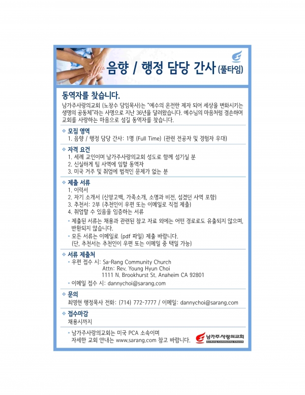 남가주사랑의교회 음향/행정 담당 간사 (풀타임) 모집 페이지 정보 SRCCㆍ2024-02-17 관련링크 이전글 다음글 목록 본문 남가주사랑의교회 음향/행정 담당 간사 (풀타임) 모집 댓글목록 등록된 댓글이 없습니다. 이전글 다음글 목록