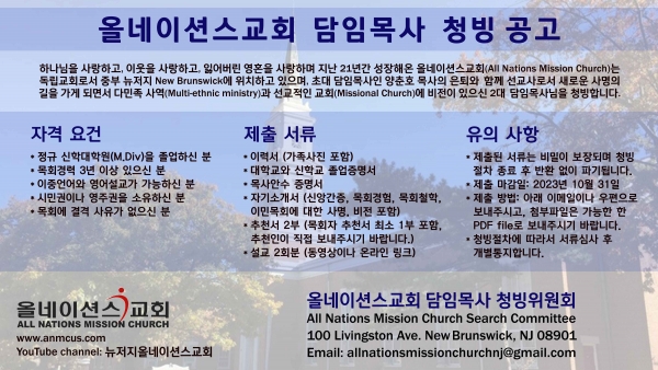 하나님을 사랑하고, 이웃을 사랑하고, 잃어버린 영혼을 사랑하며 지난 21년간 성장해온 올네이션스교회(All Nations Mission Church)는 독립교회로서 중부 뉴저지 New Brunswick에 위치하고 있으며, 초대 담임목사인 양춘호 목사의 은퇴와 함께 선교사로서 새로운 사명의 길을 가게 되면서 다민족 사역(Multi-ethnic ministry)과 선교적인 교회(Missional Church)에 비전이 있으신 2대 담임목사님을 청빙합니다.