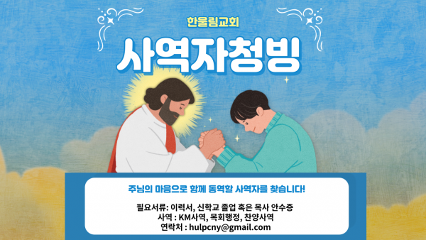 뉴욕 한울림교회/ 하프타임 사역자 청빙 페이지 정보 전도사ㆍ2021-11-21 관련링크 이전글 다음글 목록 본문 뉴욕 한울림교회에서 함께 주님의 교회를 세워갈 열정있는 사역자를 찾습니다. 많은 지원 바랍니다 댓글목록 등록된 댓글이 없습니다. 이전글 다음글 목록