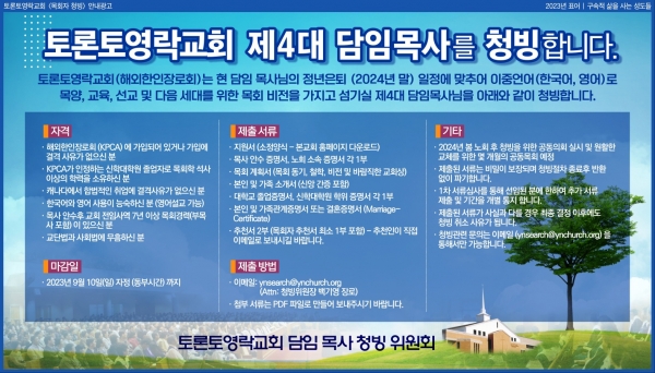 토론토영락교회(해외한인장로회)는 현 담임 목사님의 정년은퇴 (2024년 말) 일정에 맞추어 이중언어(한국어, 영어)로 목양, 교육, 선교 및 다음 세대를 위한 목회 비젼을 가지고 섬기실 제4대 담임목사님을 아래와 같이 청빙합니다.