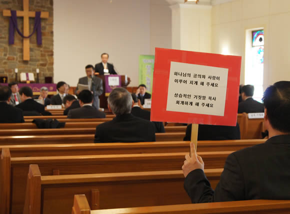 조경윤 목사는 정기노회가 열리는 뉴저지장로교회 예배당 방청석에서 하늘문교회 노회 가입건을 처리할때 "하나님의 공의와 사랑이 이루어지게 해주세요. 상습적인 거짓말 목사 회개하게 해 주세요"라는 내용이 담긴 피켓을 들고 무언의 시위를 펼쳤다.