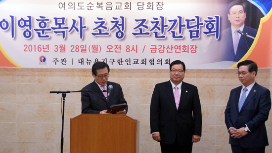 뉴욕교협(회장 이종명 목사)는 3월 28일(월) 오전 주관한 이영훈 목사 초청 조찬기도회에서 이영훈 목사에게 감사패를 증정했다. 이영훈 목사는 뉴욕교협 새로운 건물 구입과 관련하여 5만불을 후원한 바 있다. 또 최근에는 한재홍 목사가 주관하는 과테말라 학생 성경교재 보급 운동에 1만불을 지원했다. 뉴욕교협 이종명 회장은 "십계명, 부모를 공경하라의 본을 보이는 이영훈 목사의 효성을 목사와 성도들이 본받아야 될 것"이라며 5만불 지원에 감사를 표시했다.