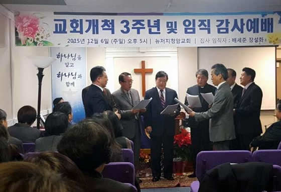 뉴저지 청암교회(김태수 목사) 창립 3주년 기념 및 임직 예배가 12월 6일(주일) 오후 5시 새로 팰리세이드로 이전한 예배당(40 Broad Ave)에서 열려 1부 창립 3주년 기념예배, 2부 집사 임직식, 3부 친교와 만찬으로 진행됐다.