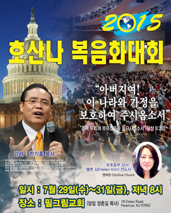 뉴저지 호산나복음화성회가 7월 29일(수)부터 31일(금)까지 3일간 오후 8시 필그림교회(양춘길 목사)에서 열린다. 강사는 LA은혜한인교회 한기홍 목사이다. 목회자 세미나는 31일(금) 오전 10시 행복한 교회에서 열린다. 뉴저지 교협 이병준 회장은 성회를 앞두고 지역교회 목회자들의 적극적인 협조를 부탁하는 메세지를 보냈다. 그 내용이 신선하기에 소개한다.