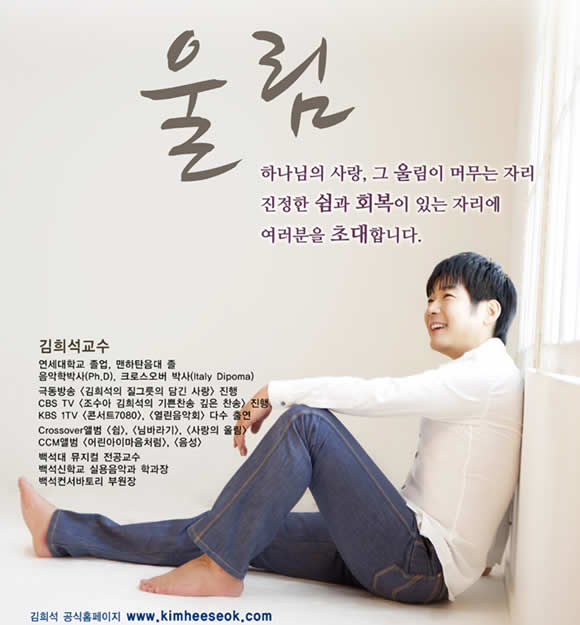 김희석 교수의 찬양집회는 특별한 위로와 쉼이 있다. 그가 부르는 노래의 고백은 잔잔하고 평안한 가운데 깊은 울림을 준다. 또한 관객들 함께 공감하며 나누는 잔잔한 이야기들, 또한 메시지를 담은 영상으로 크리스찬 뿐만 아니라, 주위의 믿지 않는 이들도 편한 마음으로 와서 하나님의 사랑을 체험하고 쉼을 얻을 수 있는 시간이 될 것이다.