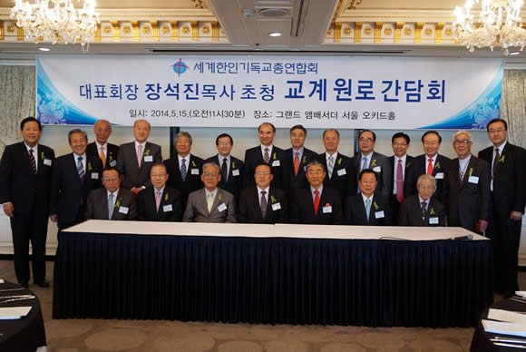 세계기독교한인총연합회는 지난 5월 15일 그랜드앰버서더호텔 오키드룸에서 대표회장 장석진 목사 초청 ‘한국교회 원로 간담회’를 개최했다. 이날 간담회는 세계 한인교회를 기반으로 한 연합체 수장으로서 한국교회 원로 목회자들을 초청해 상견례 자리를 갖고 향후 세기총의 계획을 알리고 관심을 요청하기 위해 열린 자리로 마련되었다.