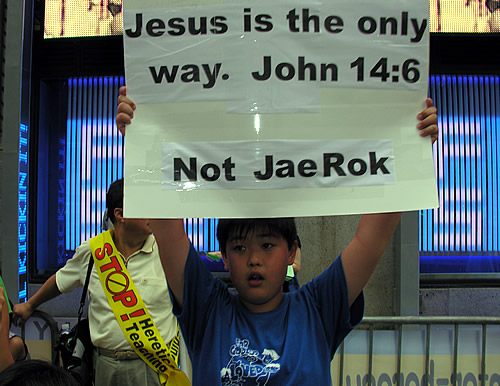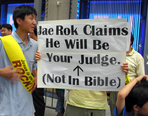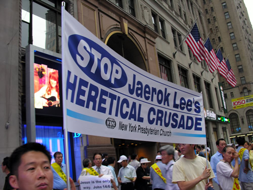 현수막에는 "Stop Jaerock Lee's Heretical Crusade" "Jesus is the only way, not Jaerock"등 이재록씨의 이단성을 지적하는 내용이 많았다.