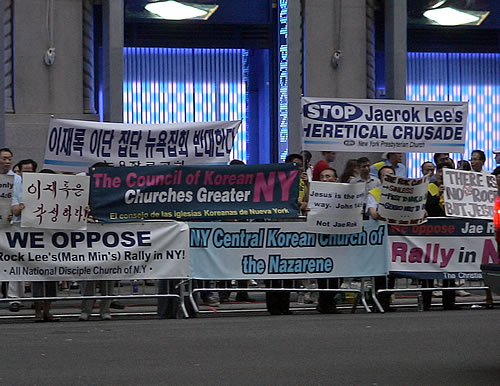 한국에서 이단으로 판정된 만민교회 이재록씨의 뉴욕집회를 반대하는 항의시위가 열렸다.