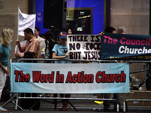 뉴욕목사회는 전, 현직 회장 부회장등이 시위에 참가했으며 시위기간동안 900여개의 물을 제공한다. 시위에 참가한 목회자들은 "Rock! No!"라는 글이 적혀있는 노란 띠를 두르고 목이 터지라 기도와 구호를 외쳤다.