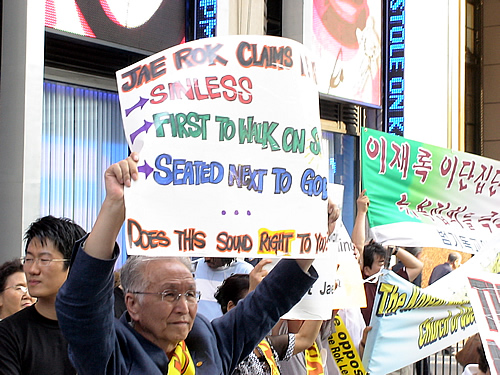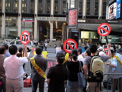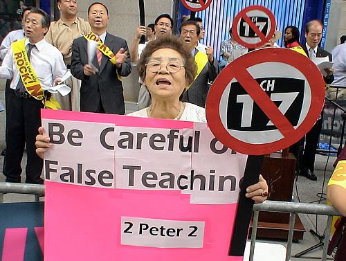 범기독교이단대책협의회(상임의장 김남수 목사)는 7월 28일(금) 전날과 비슷한 200여명이 모인 가운데 이재록씨 뉴욕집회를 반대하는 시위를 2일째 가졌다. 반대시위는 이재록씨 집회장소인 매디슨스퀘어가든과 도로를 두고 마주 보는 장소(7 Ave 선상 31St 과 32St 사이)에서 오후 6시 부터 8시 30분까지 열렸다.