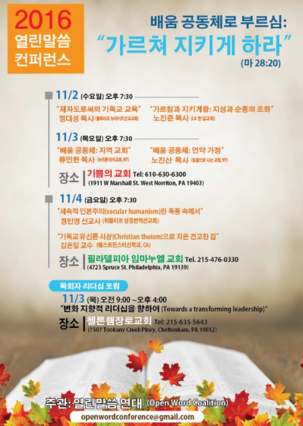 열린말씀연대가 주관하는 ‘2016 열린말씀 컨퍼런스’가 11월 2일부터 4일까지 필라지역에서 "배움 공동체로 부르심: 가르쳐 지키게 하라(마28:20)"이라는 주제로 열린다.