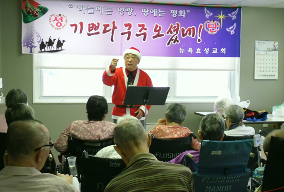 성탄절을 앞둔 12월 20일 오전, '플러싱 매너 너싱 홈'의 노인들은 외롭지 않았다. 뉴욕효성교회 김영환 목사등이 올해도 방문하여 노인들을 위한 특별 예배를 열고 선물도 나누어 주었다.