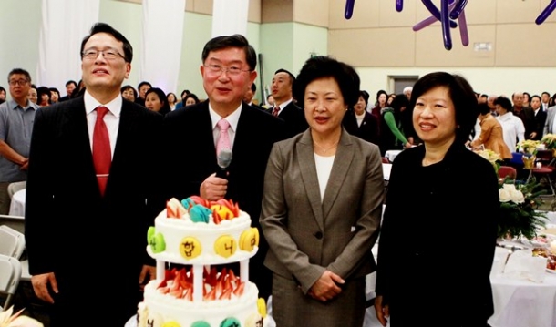 ▲ 손인식 목사 북한선교사 파송예배 및 송별예배가 지난 15일 오후 5시 베델한인교회서 열렸다. 이날 ‘감사합니다’라고 쓴 케익 앞에선 후임 김한요 목사(왼쪽부터), 손인식 목사, 손승옥 사모, 그리고 김한요 목사의 부인 김정연 사모.