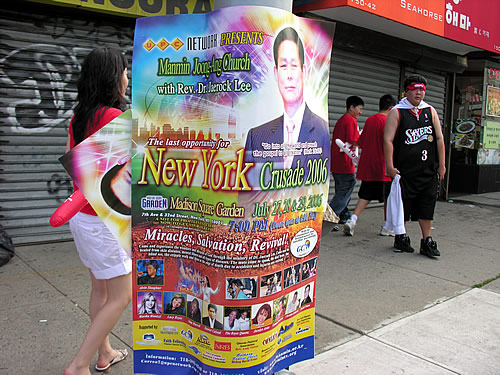 월드컵 한국과 스위전이 열리던 23일(금) 노던블러바드 선상 전봇대에는 이재록씨의 뉴욕집회를 알리는 광고물이 군데 군데 자리를 잡고 있었다. 그옆에는 빨간 티셔츠를 입은 젊은 청년들이 영문도 모르고 지나가고 있었다.