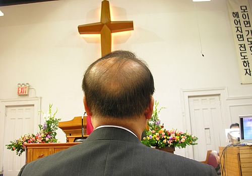 바로 앞에 앉은 하용조목사님의 뒷모습입니다.